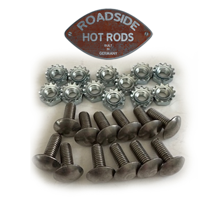 Scheinwerfergehäuse Befestigungsschrauben Edelstahl A-13011-MB Scheinwerfergehäuse-Befestigungsschrauben. Kopf ähnelt einer Niete. 12 Schrauben 12 Muttern. USA 1928–1934 Edelstahl, Kopf ähnelt einer Niete. 15-C-1